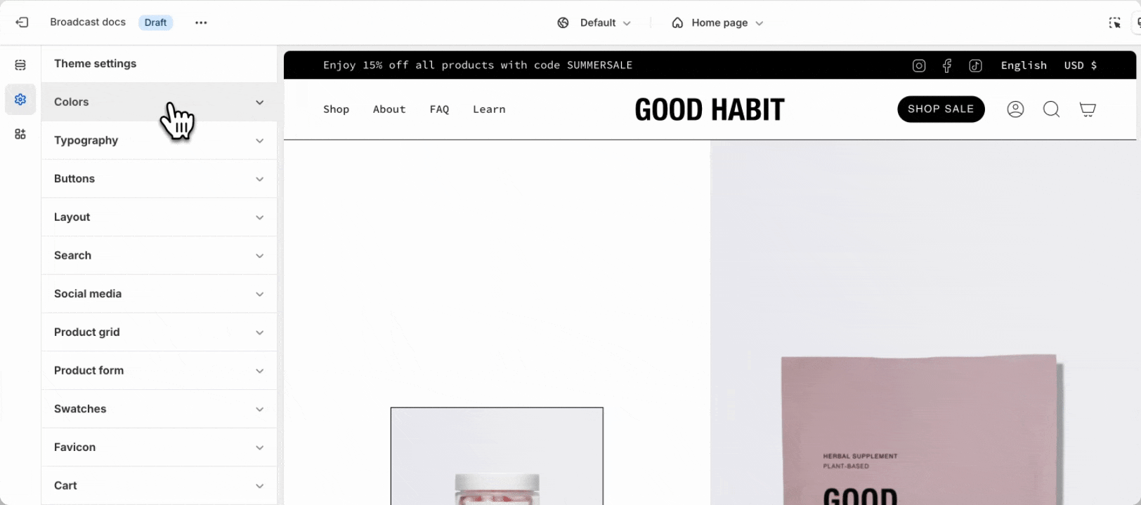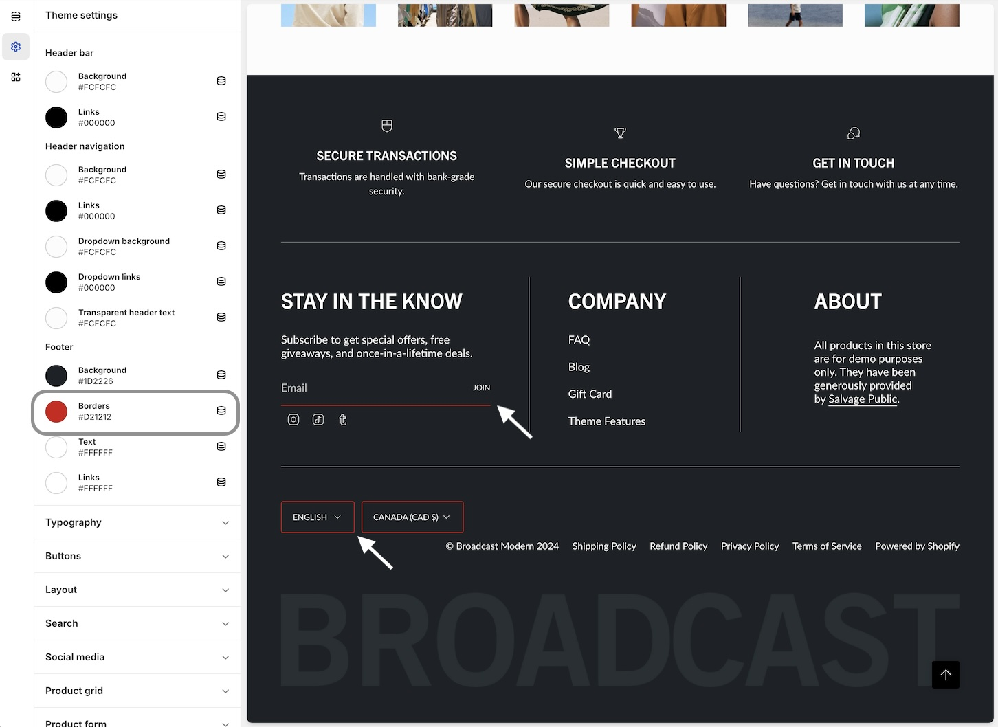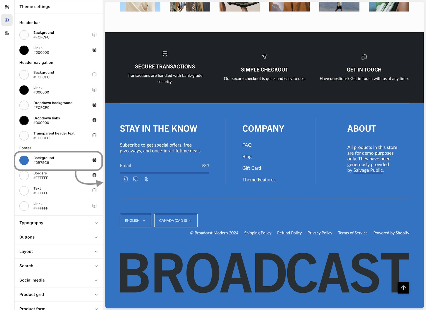 Broadcast 6 includes Shopify's Color Schemes for managing colors throughout your theme: