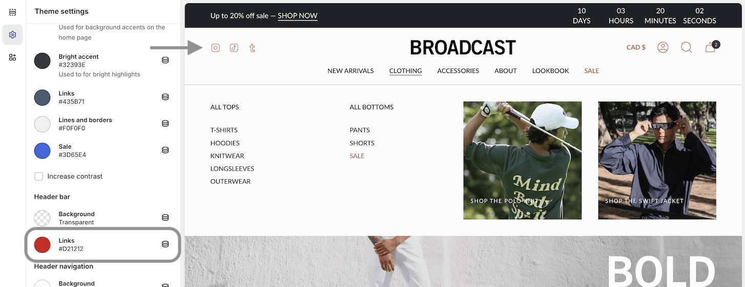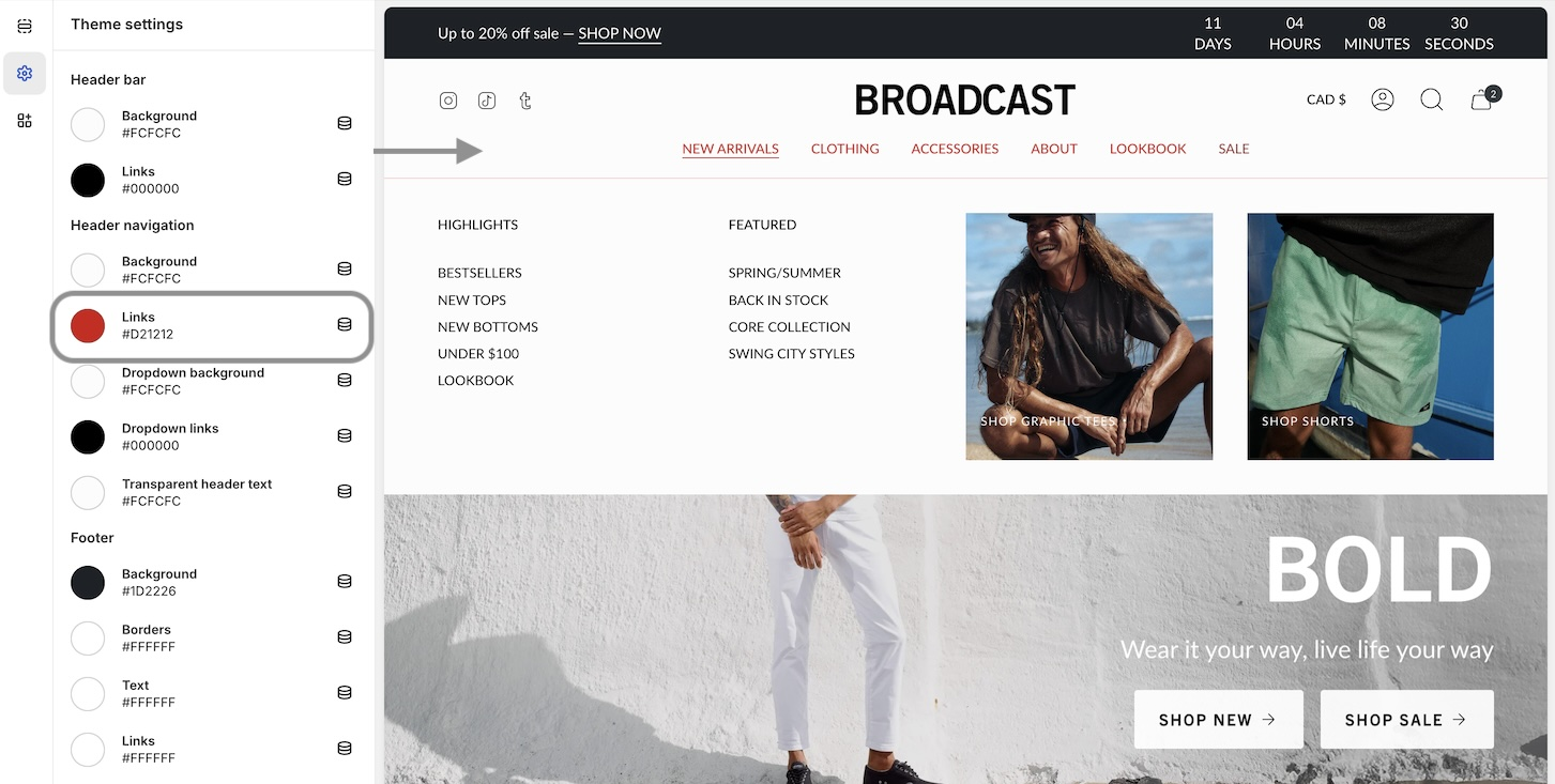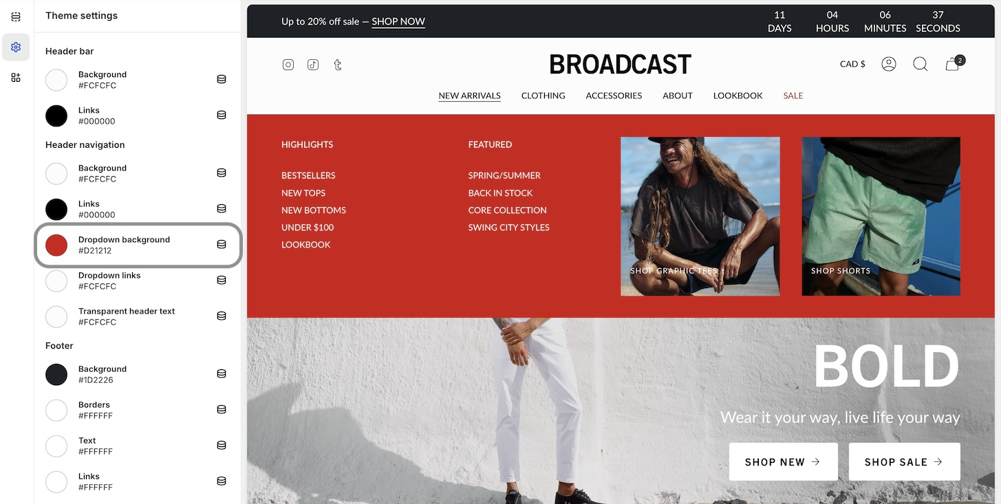 If you're updating from an earlier version of Broadcast, you can view your site's color choices from the live theme. This will be helpful when you're building the newer version from the drafts folder. The Shopify update tool cannot copy your original color choices. However, you can view them from the live theme and create new color schemes with the latest version.