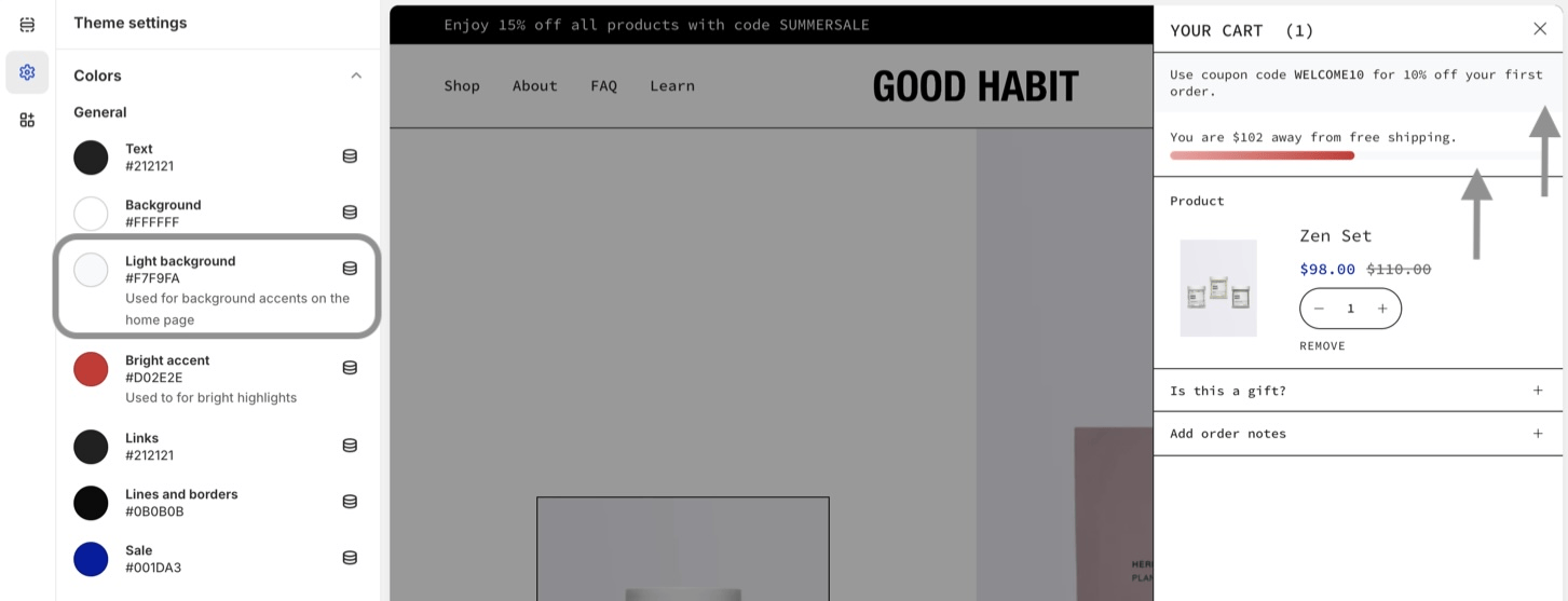 The light background setting is used for background accents like the coupon message in the cart drawer. It's also used in the free shipping indicator with the bright accent color setting.