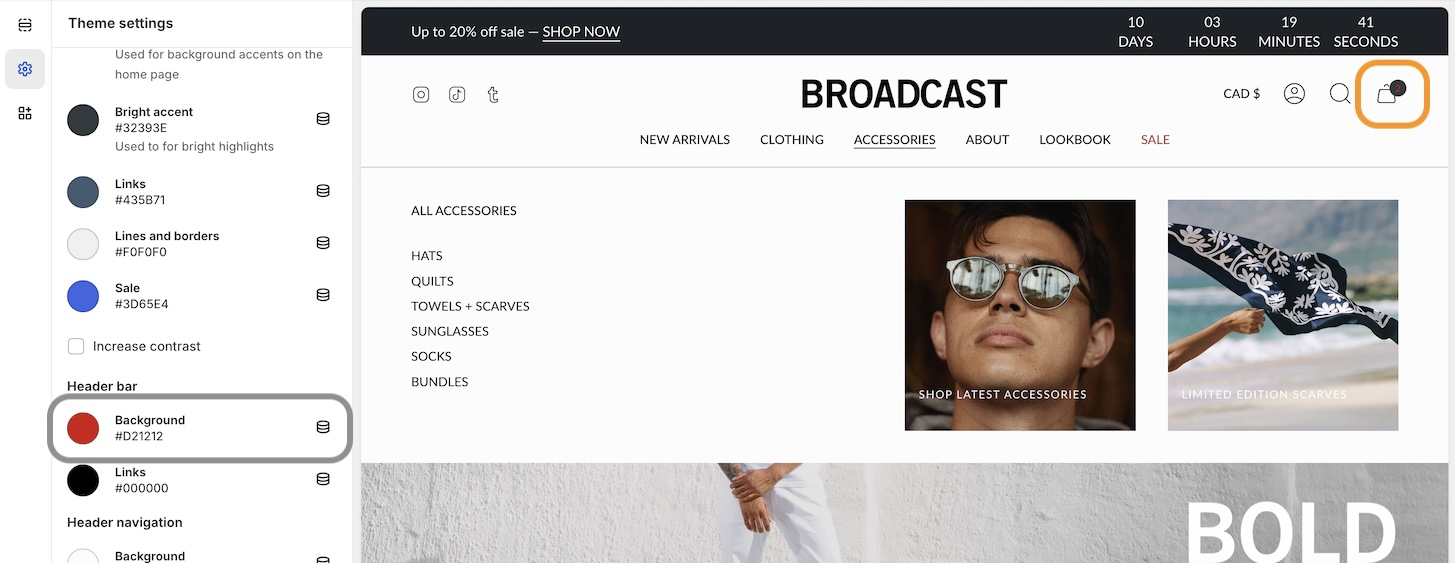 The bright accent is a highlight color for elements like the free shipping progress bar shown above in red and also the cart bubble indicator in the header: