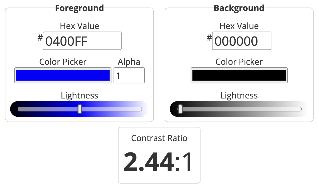 Poor score, 2.44:1 - Blue foreground on Black background: