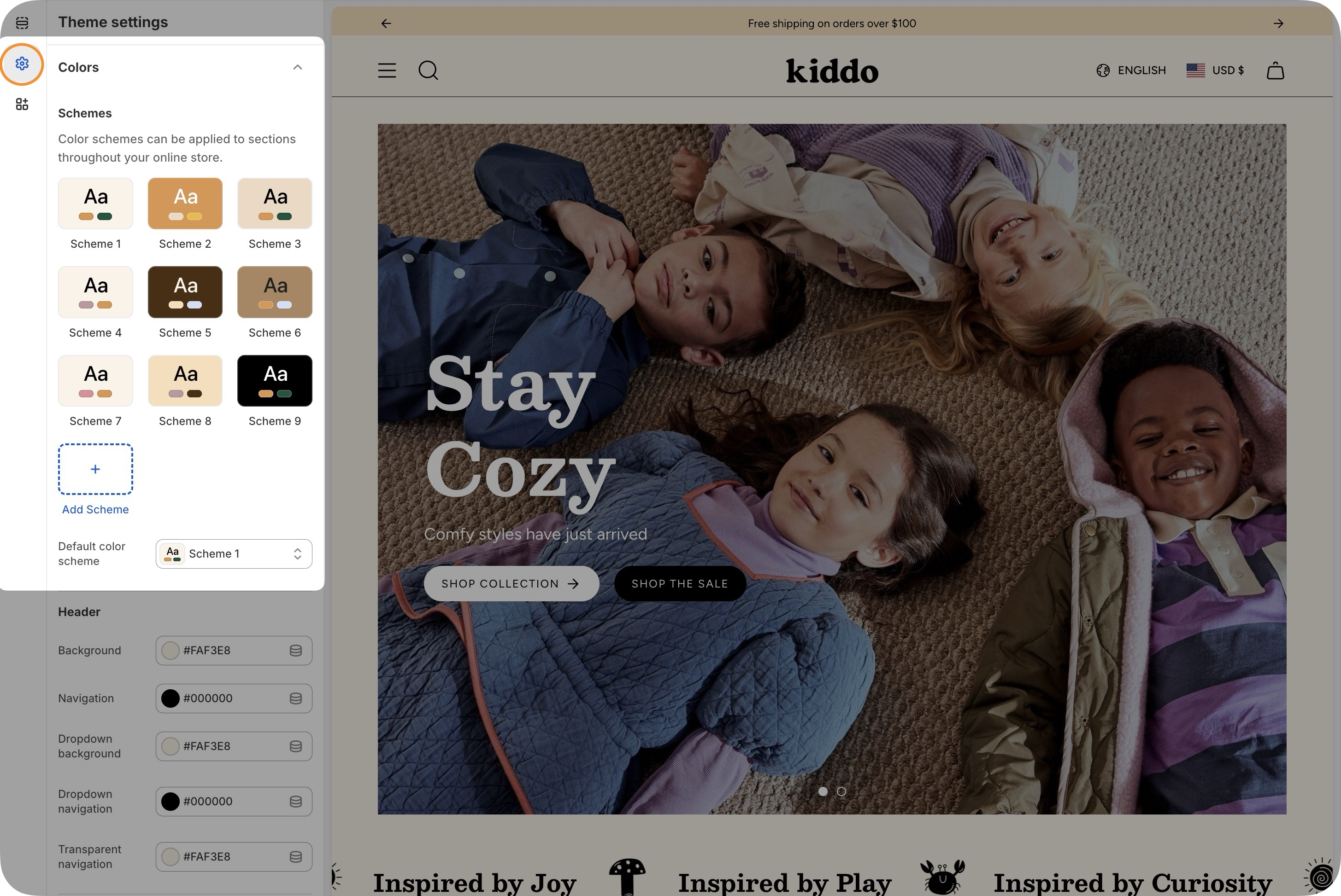 Color schemes help ensure the consistency of your brand colors across all sections and allow for easy changes. Customize the palettes in the Theme Settings under Colors, then apply a palette or scheme to existing sections.