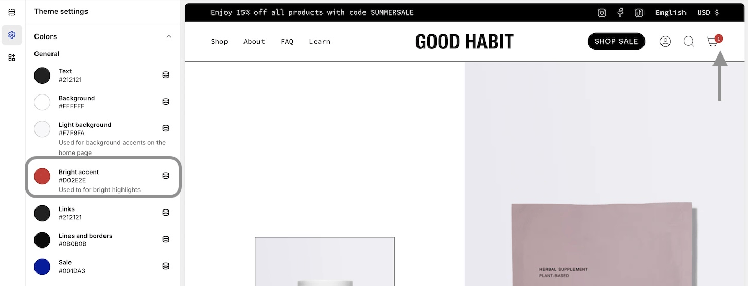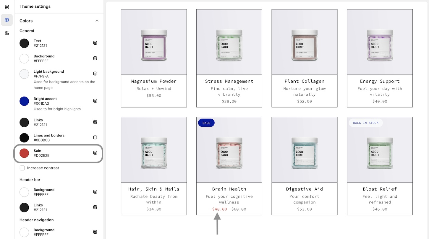 Tip: These are your primary brand colors used throughout the theme. Some sections or blocks have their own color settings for even greater control.