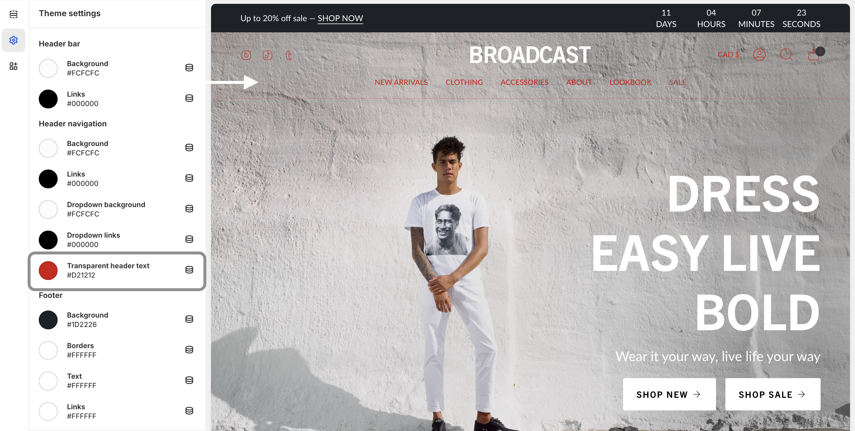 Note: When using a transparent header, these colors are used when the dropdown is activated. The transparent header has a separate setting while inactive. That setting is in the next group.