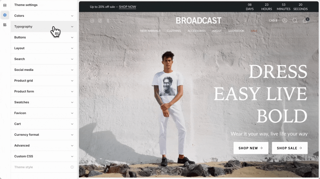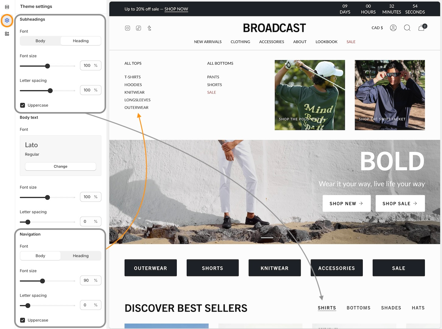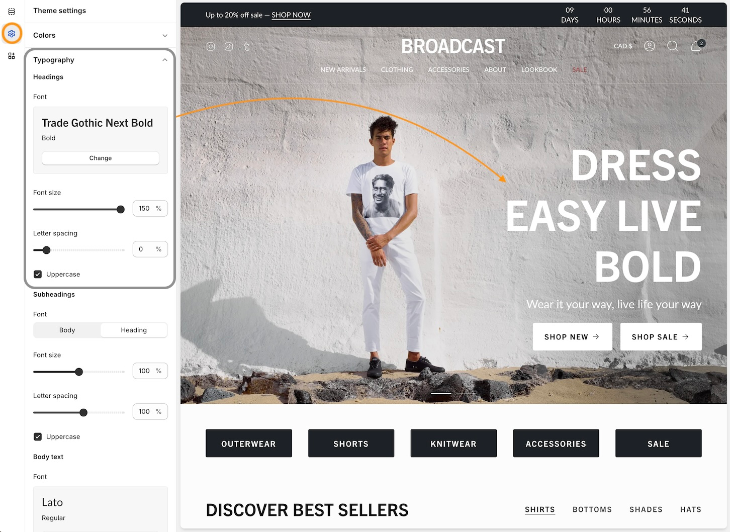 Broadcast uses two primary fonts: Heading and Body. You can choose these font values from a large library of professional fonts provided for free from Shopify by Google. After choosing these two font types, you can customize different elements throughout the theme with these default choices.