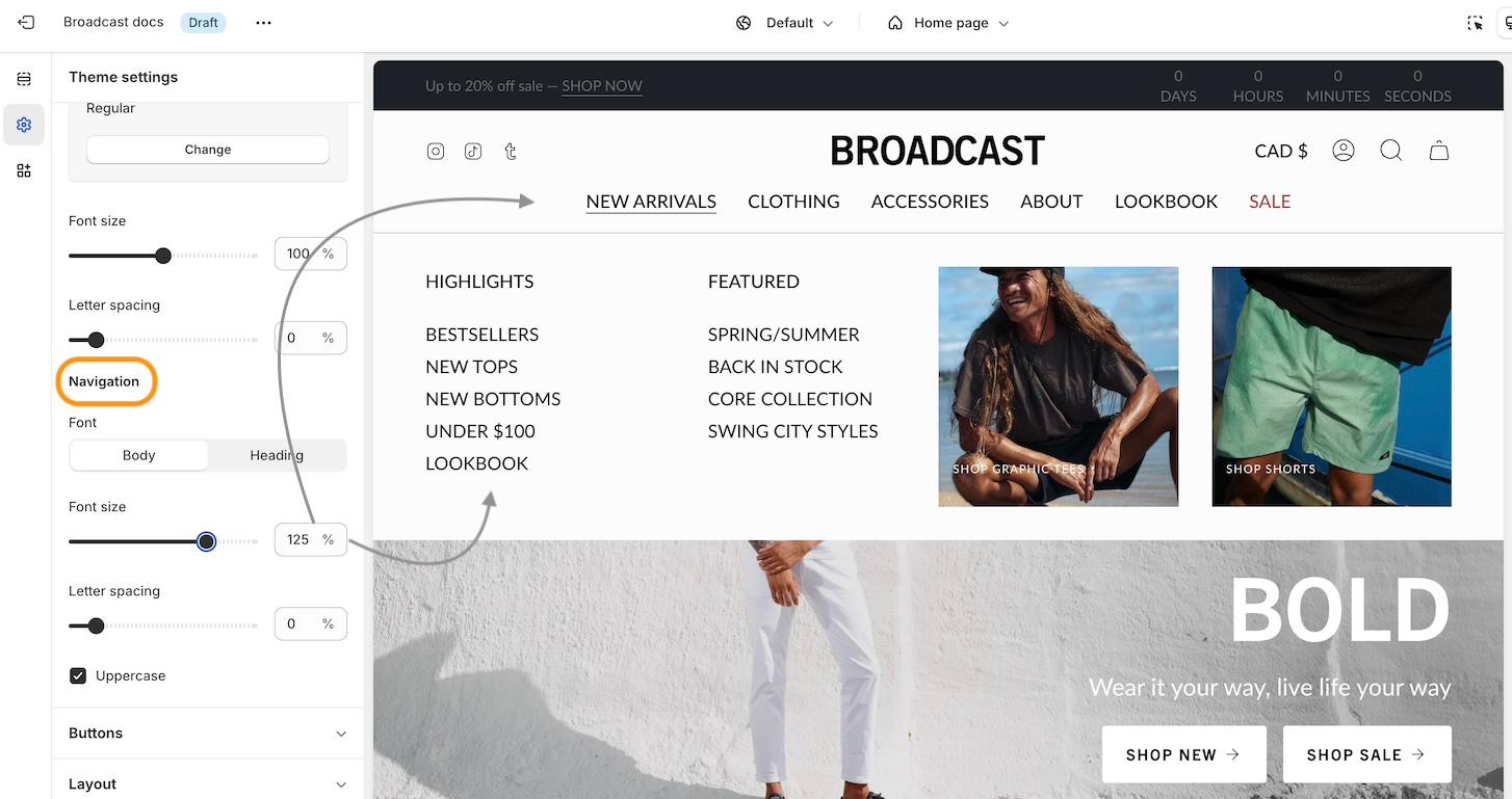 If you're updating from a previous version of Broadcast, similar to colors, you can use your live theme as a reference when setting up your new draft theme typography.