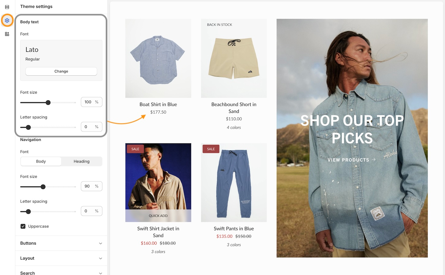 Let's look at the body text font next. Choose a font for your primary body text, which will be used for descriptions, blog posts, product information, and more.