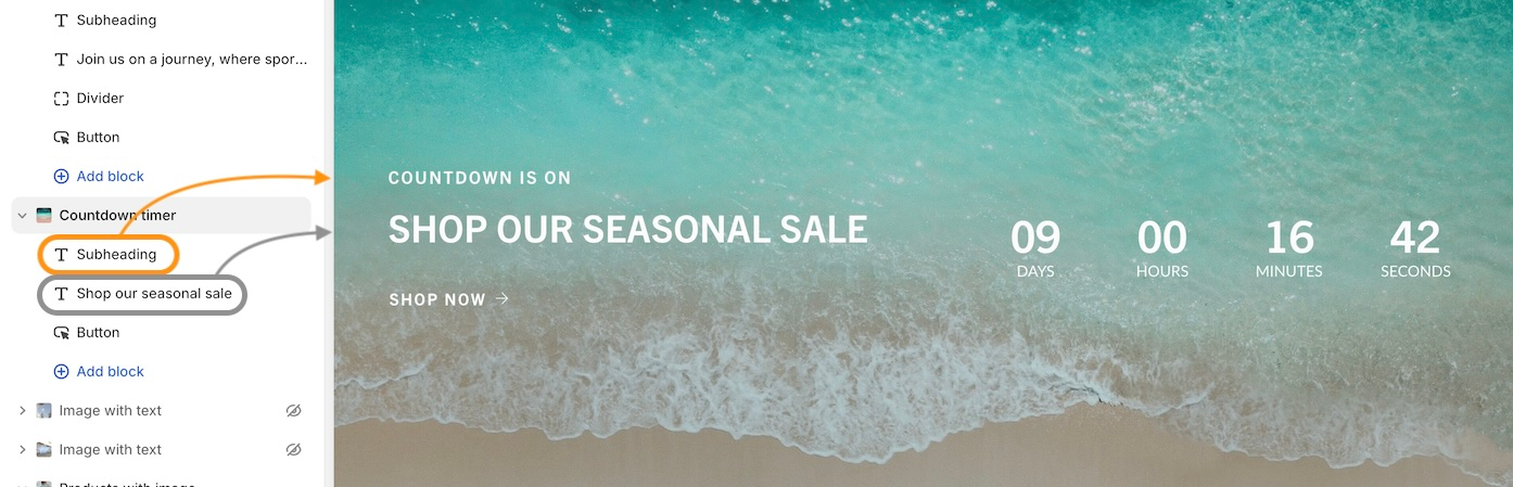 In the above Countdown section example, the Subheading block is used above the Heading block.