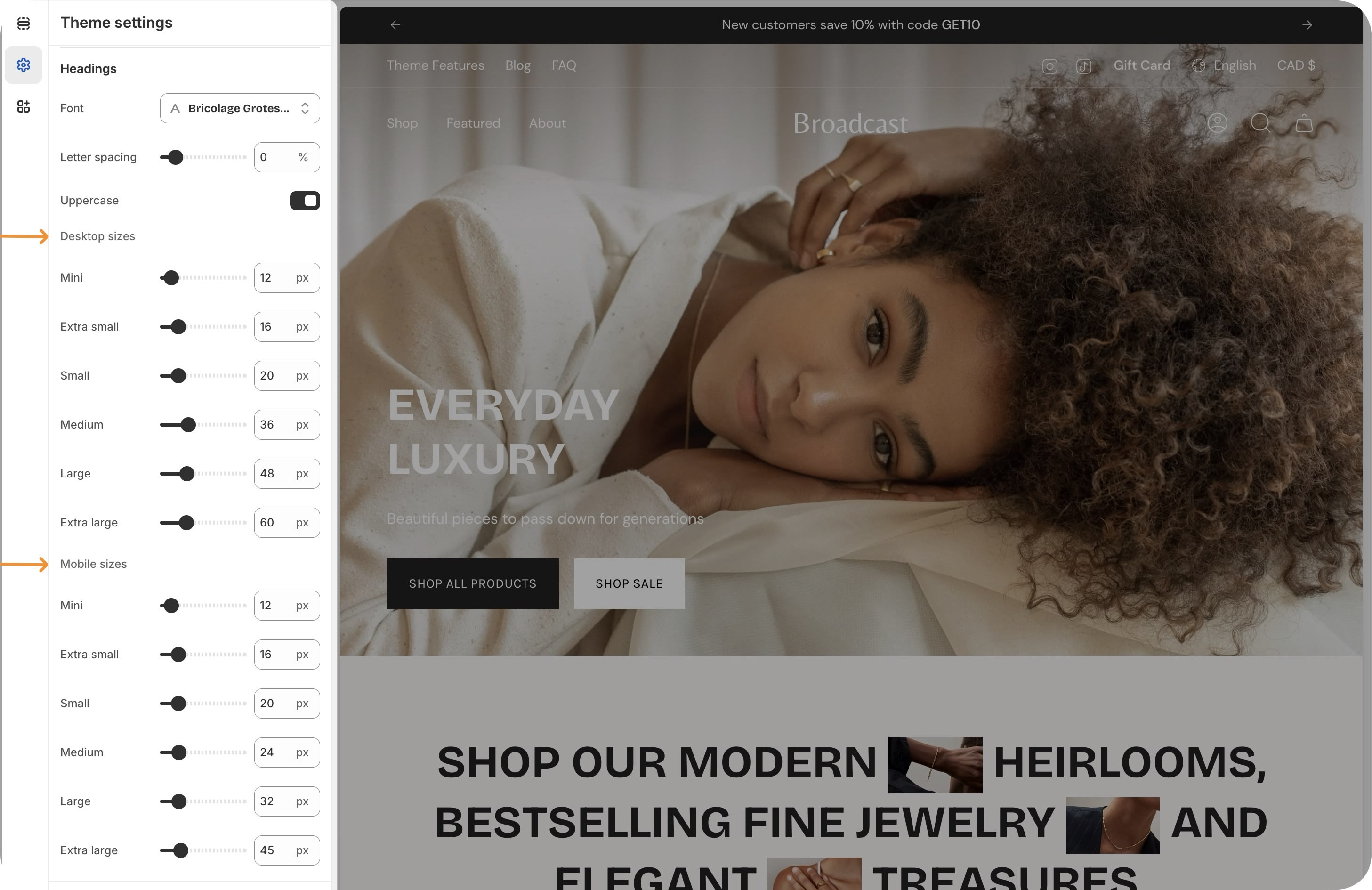 Predefine your Headings font options for desktop and mobile with granular controls in the Theme Settings: