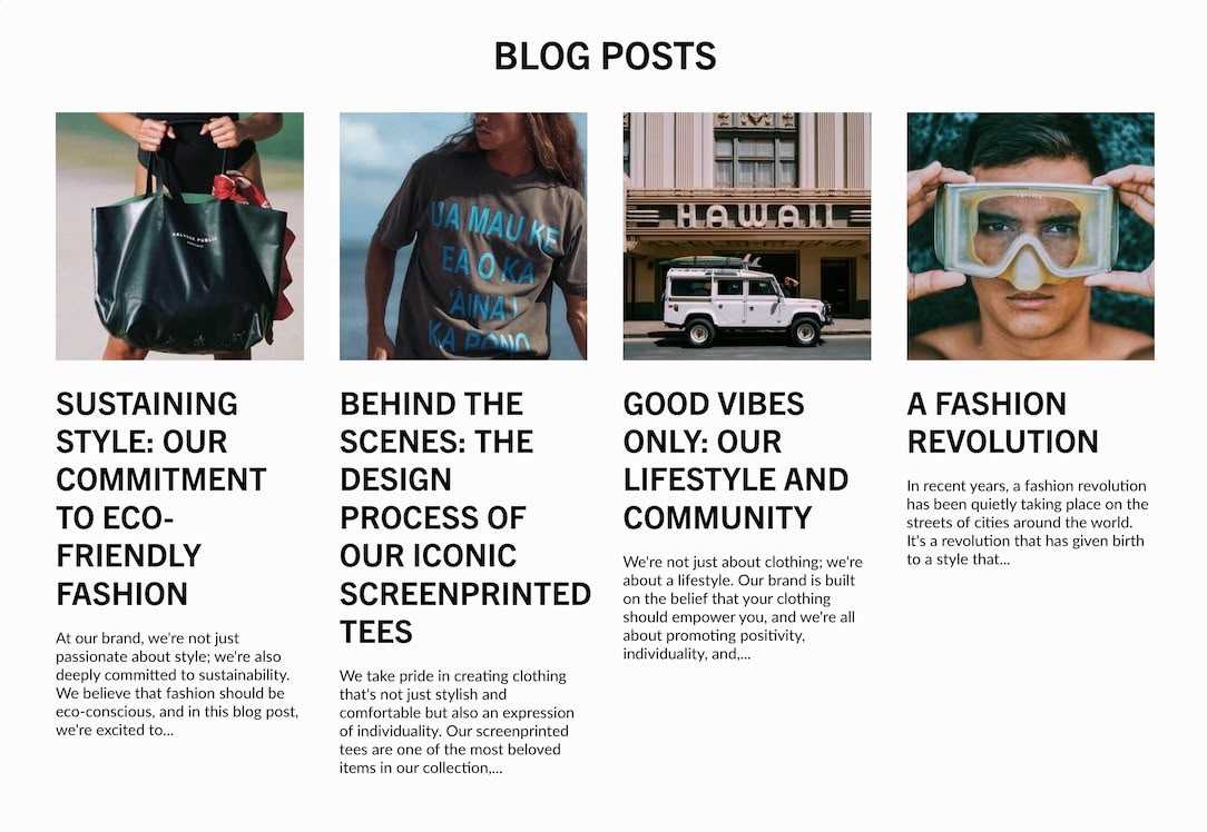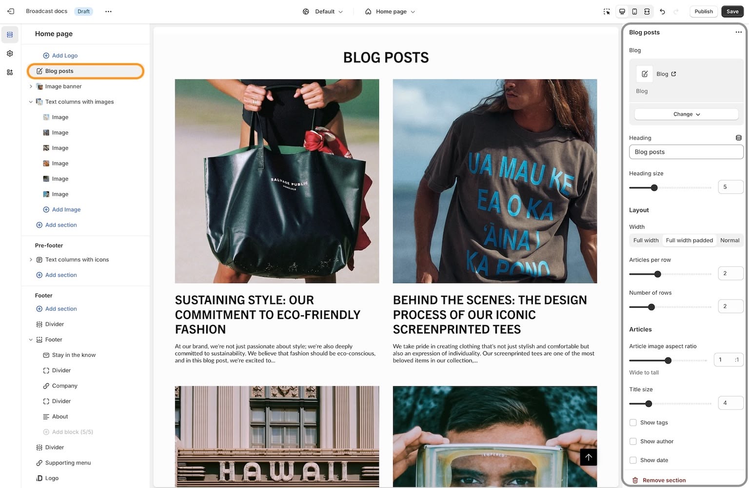 Broadcast includes a rich Blog posts section to display the most recent posts on your site quickly: