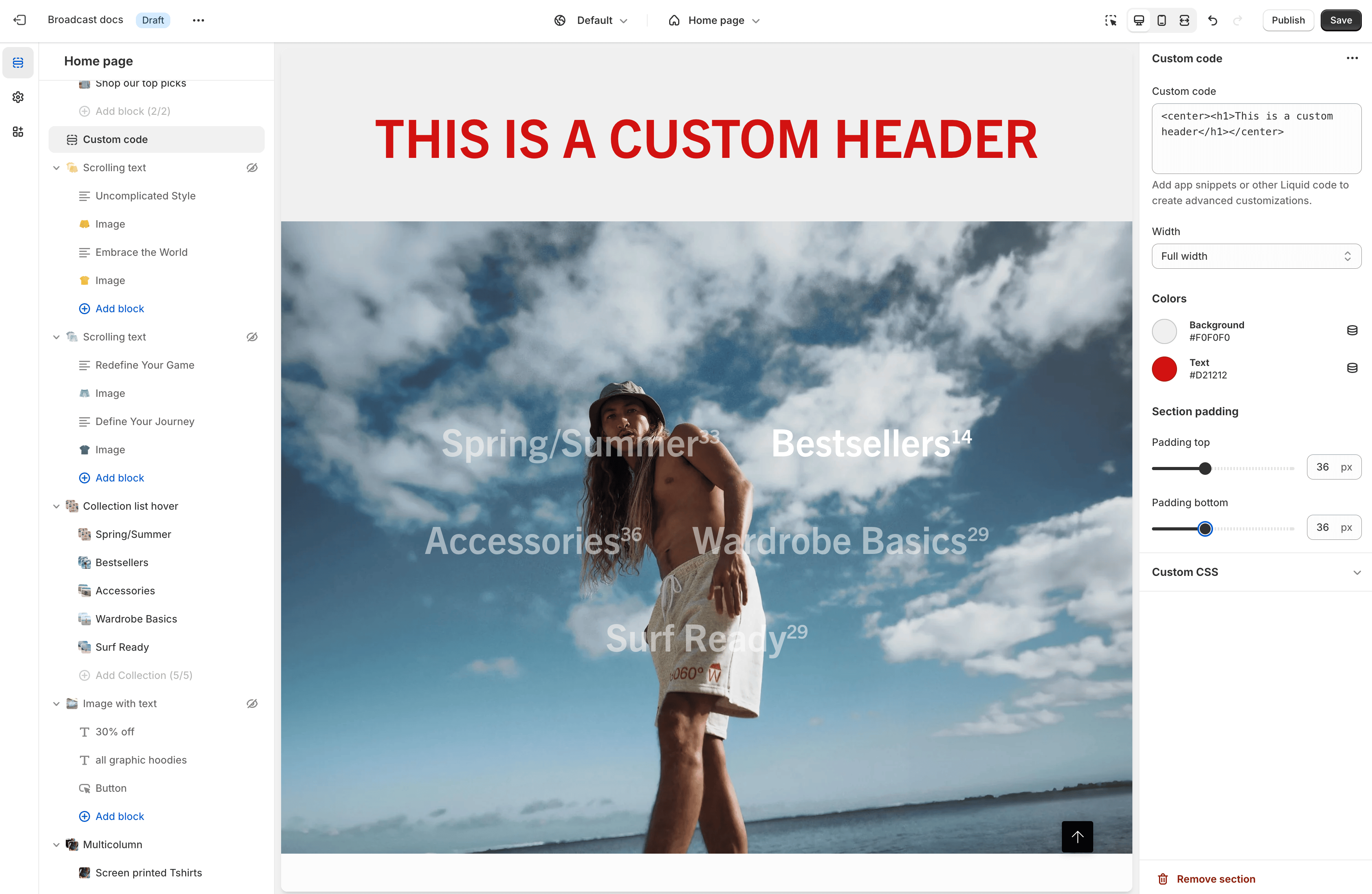 This video demonstrates adding custom HTML, Liquid code, and the Custom CSS feature: