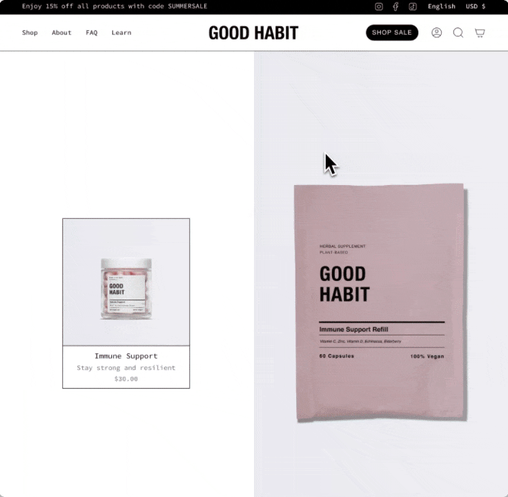 Scroll through product images with Broadcast's captivating product section. Highlight the featured product while shoppers scroll through the page.